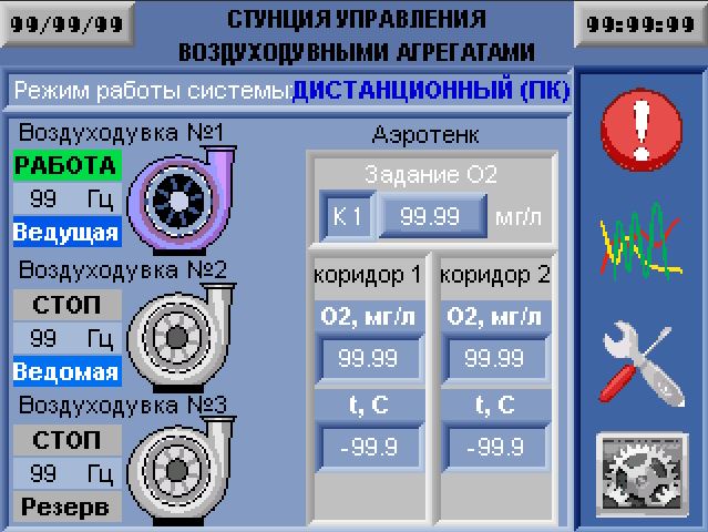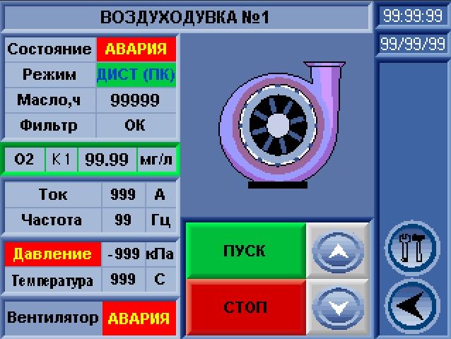 Станция управления позволяет контролировать необходимые технологические параметры воздуходувки (давление воздуха на выходе, температура на выходе, температура двигателя, засорение фильтра всасывания, все электрические параметры двигателя (с частотного преобразователя по протоколу Modbus) и т.д.), обеспечивает связь и передачу всех необходимых параметров на верхний уровень системы диспетчеризации и/или автоматизации по протоколу Modbus.