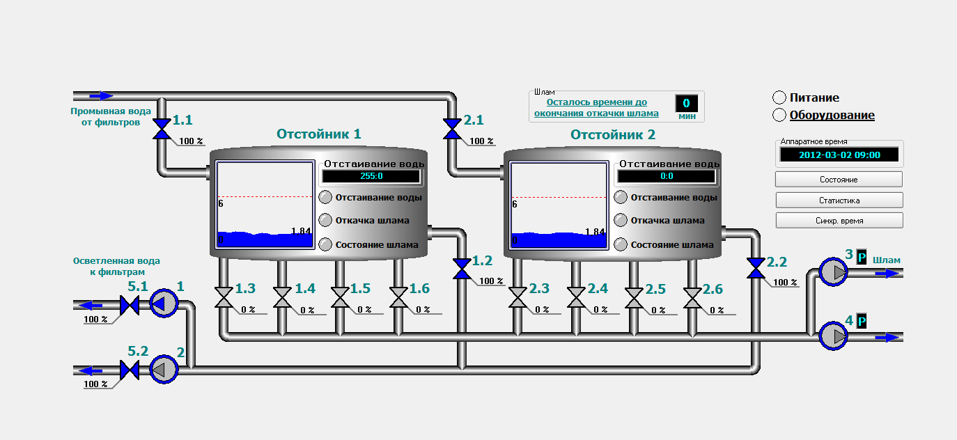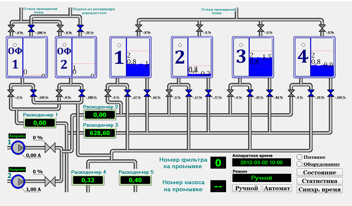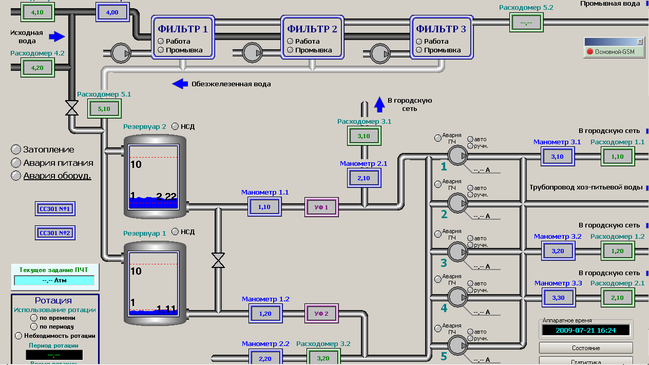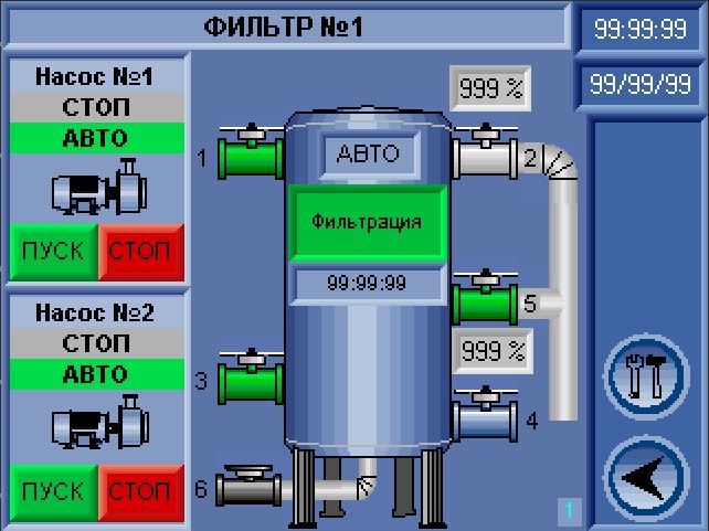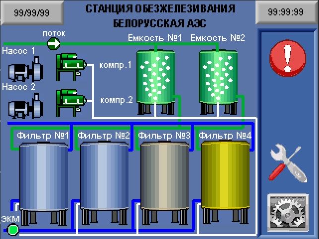 - РУЧНОЙ – управление осуществляется при помощи сенсорной панели, с мнемосхемой станции обезжелезивания, расположенной на лицевой панели щита, а также ручных постов управления, расположенных в непосредственной близости от узлов системы (фильтр, насос, задвижка, компрессор, и т.д)