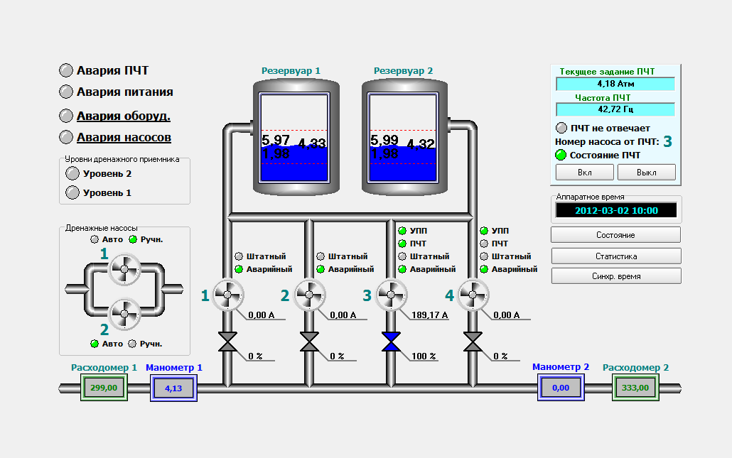 - АВТОМАТИЧЕСКИЙ – управление производиться автоматически по технологическому алгоритму, установленному технологом. Доступ в данном режиме ограничен паролем.